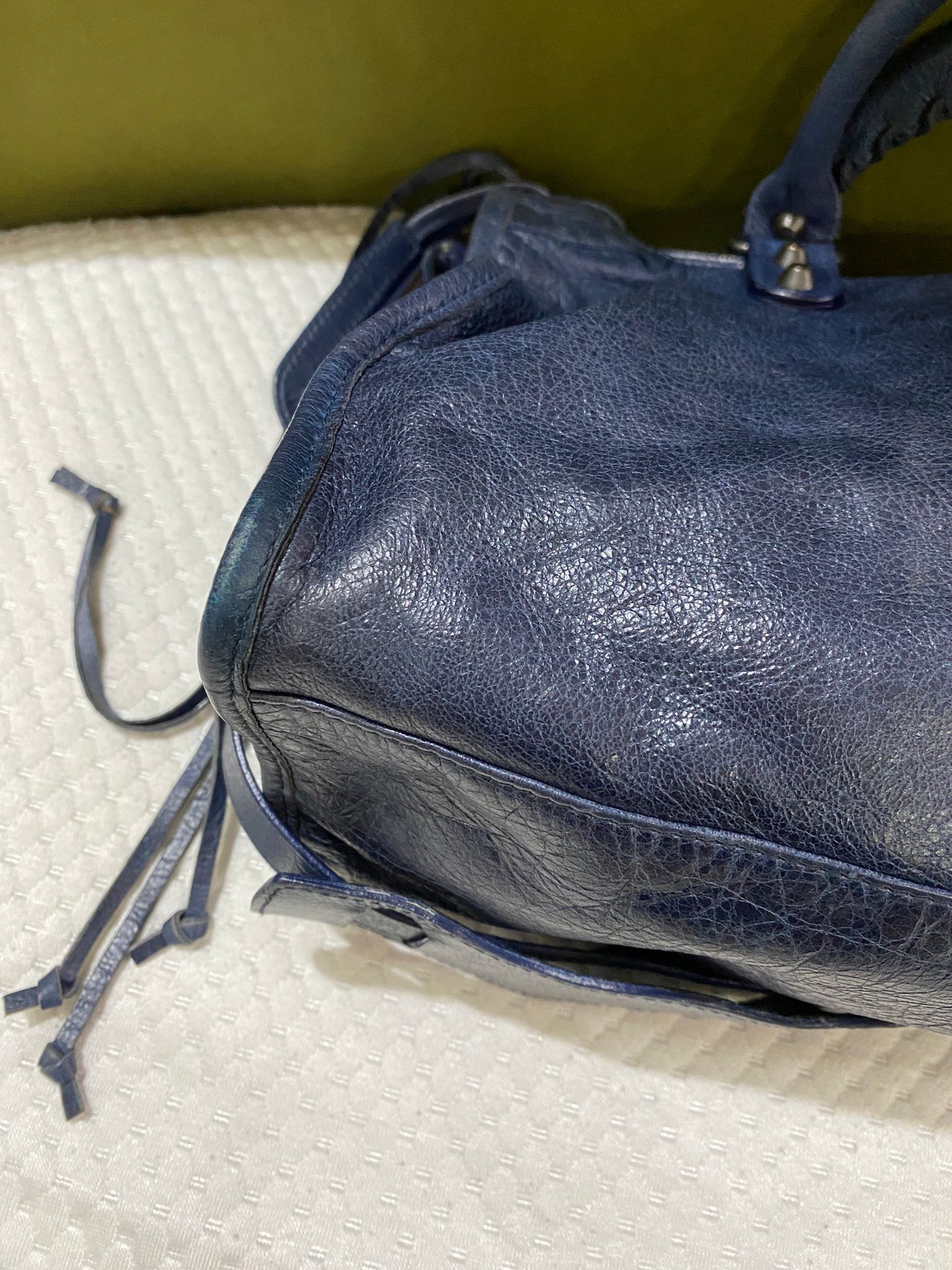 This Balenciaga blue leather bag is expertly crafted from Italian leather, providing a luxurious and timeless addition to any wardrobe. Its zip up compartment and braided handles make it both stylish and functional for everyday use. Elevate any outfit with this versatile and elegant bag.