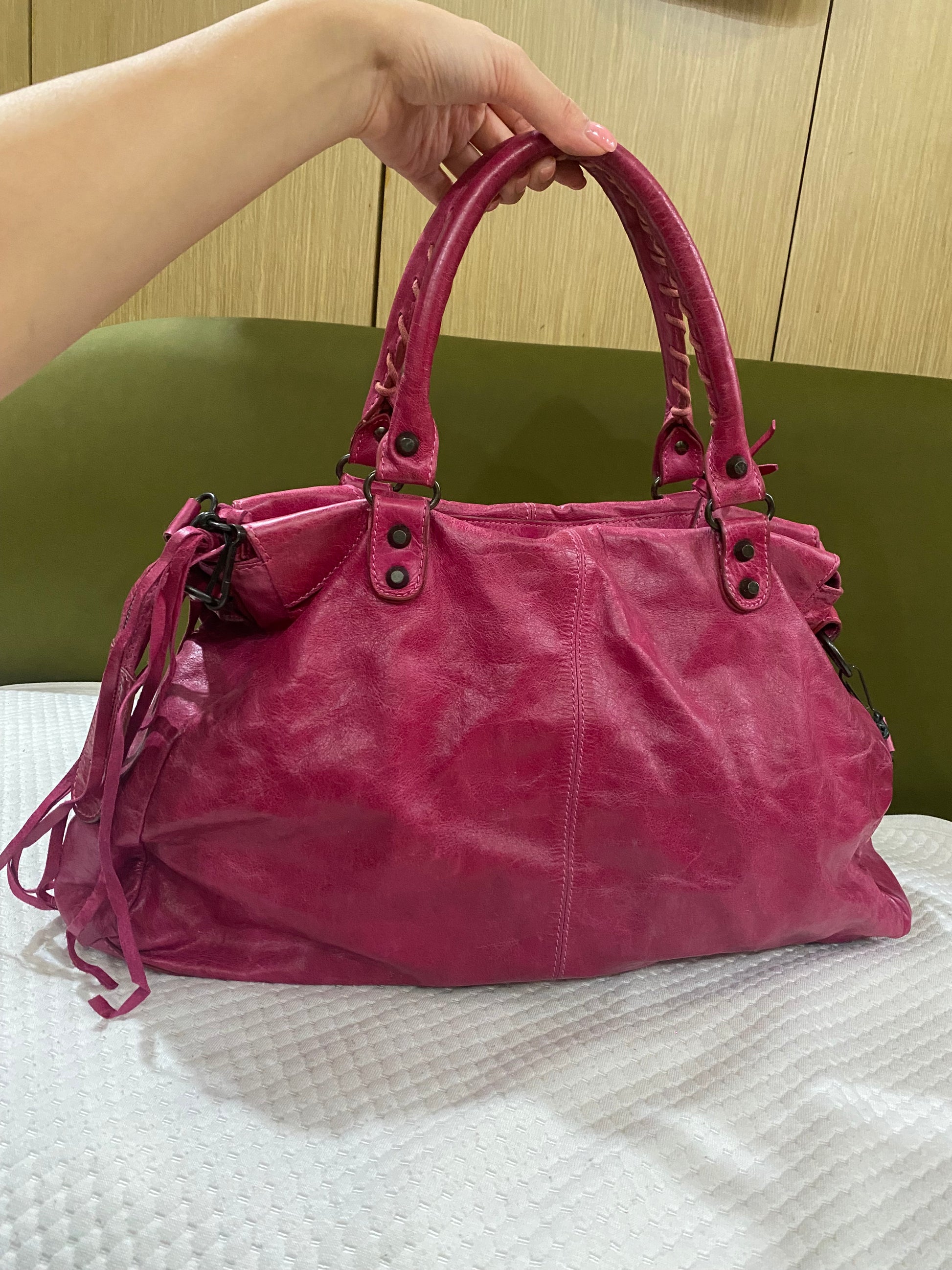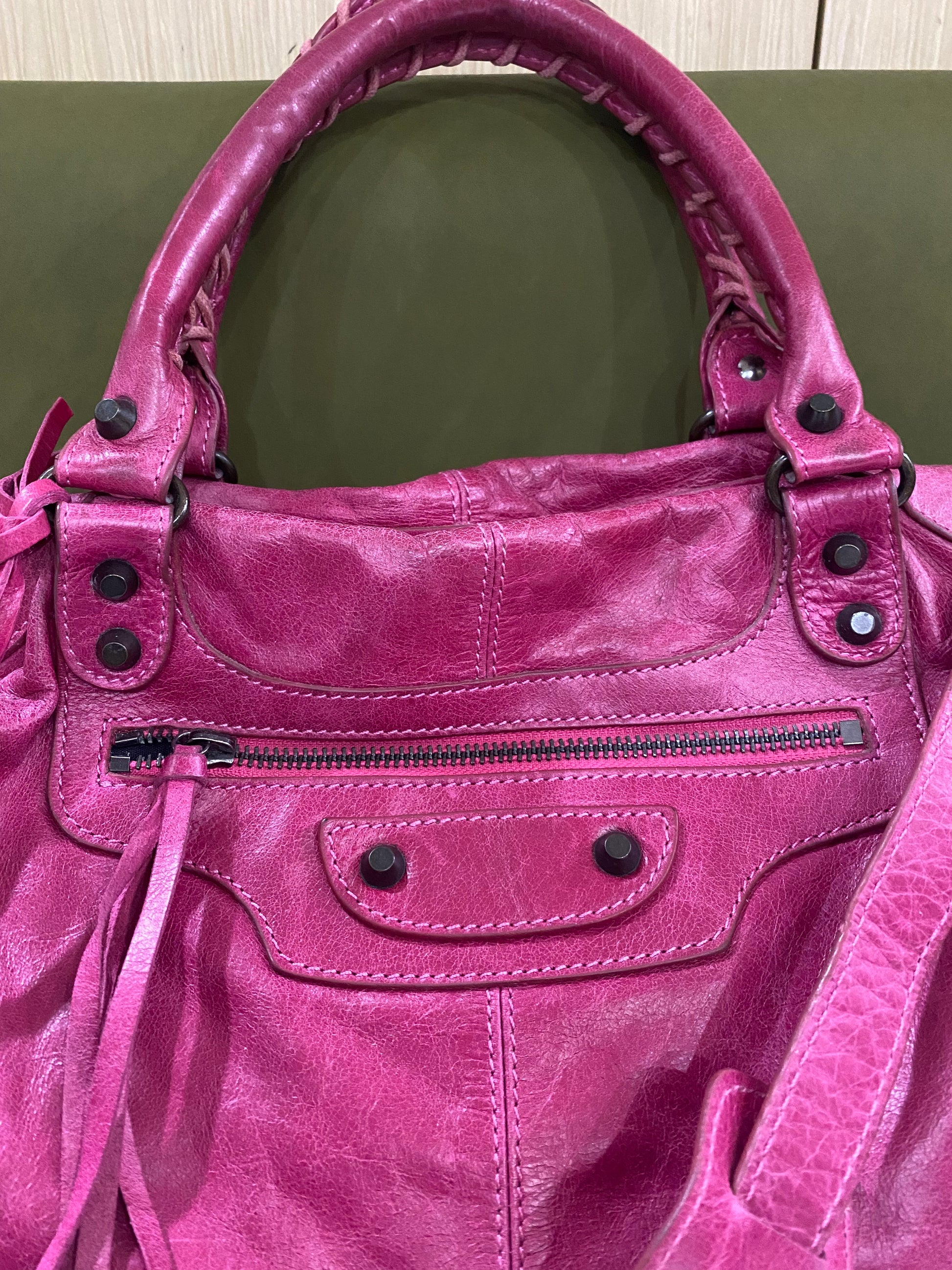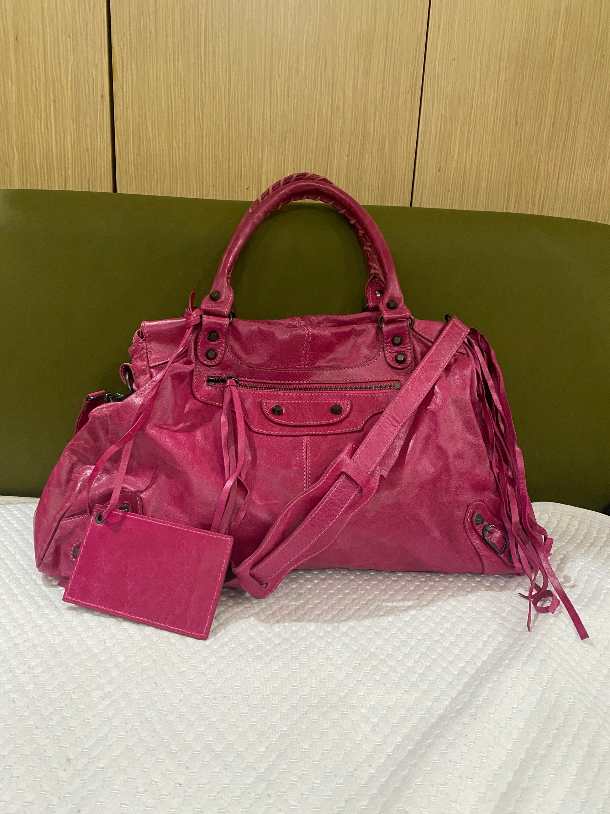 The Classic Motocross City features a leather body with tassel zipper pull details, rolled handles, antiqued brass studs, an exterior zip pocket, a top zip closure, and an interior zip pocket.