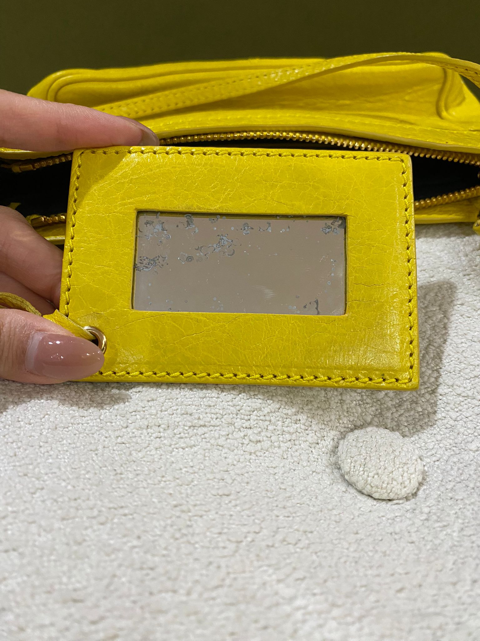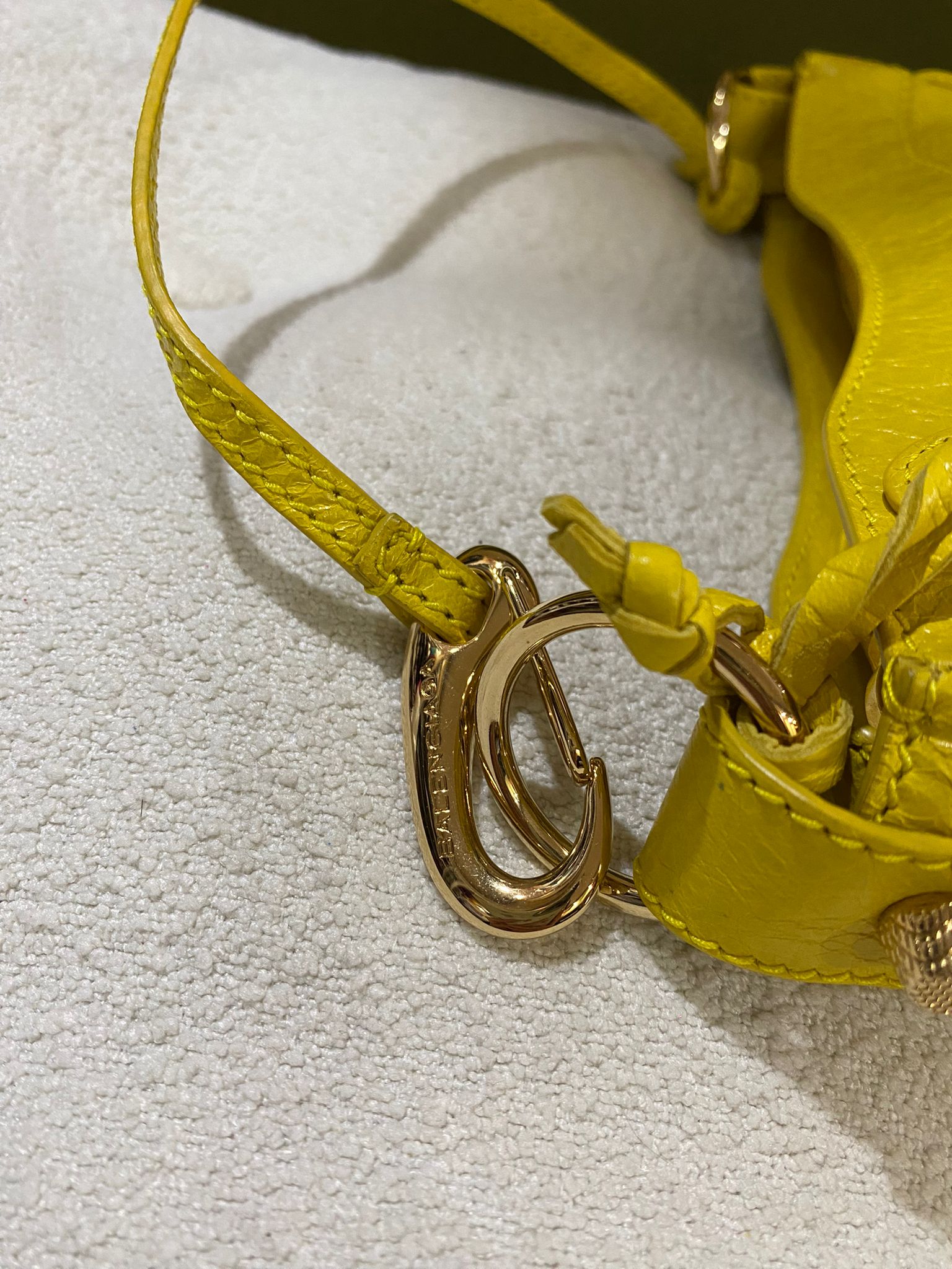 This Balenciaga yellow leather pochette shoulder bag is expertly crafted from Italian leather, providing a luxurious and timeless addition to any wardrobe. Its zip up compartment and fun color make it both stylish and functional for everyday use. Elevate any outfit with this versatile bag.