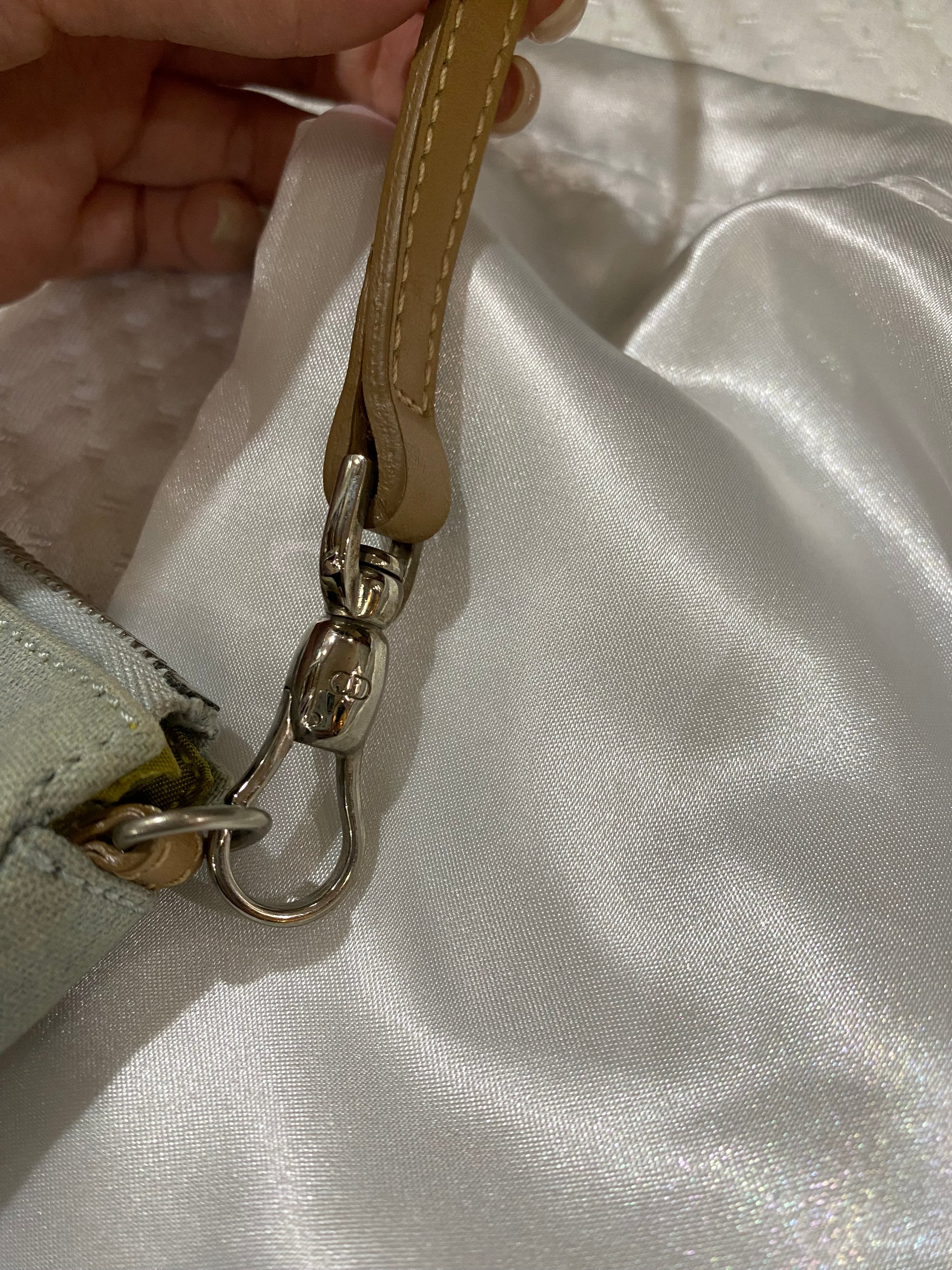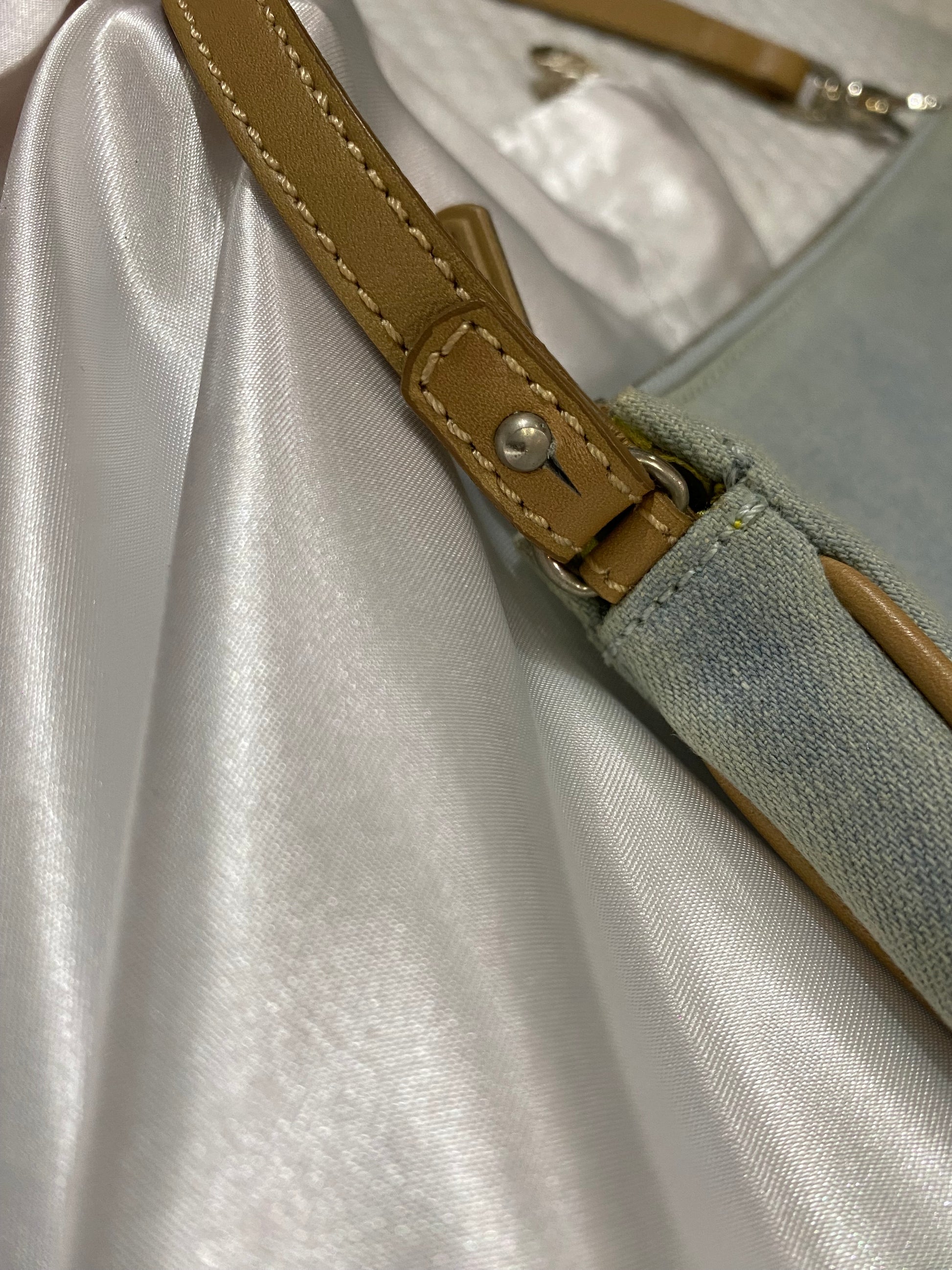 Material: denim canvas, leather, silver-tone hardware
