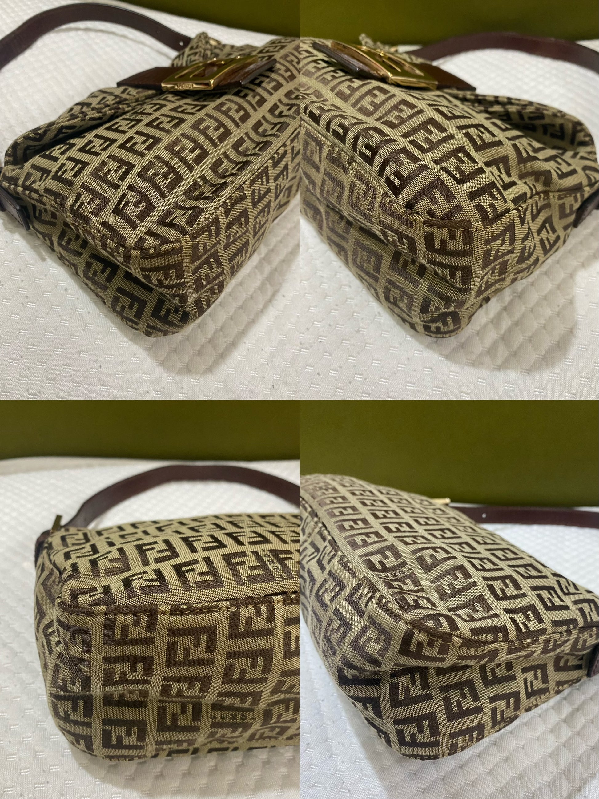It features an adjustable brown leather looping top handle and a bold gold Fendi logo on the front. Gold hardware throughout. The crossover flap opens to a dark fabric interior with a zipper pocket. Magnetic snap fastening. This is a chic bag that is suitable for everyday wear.
