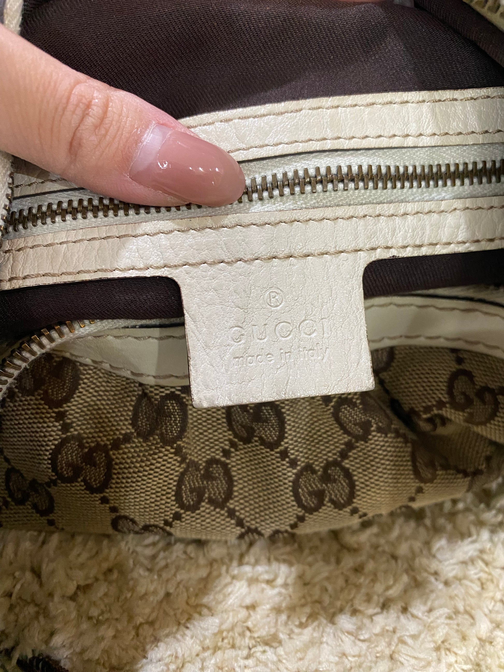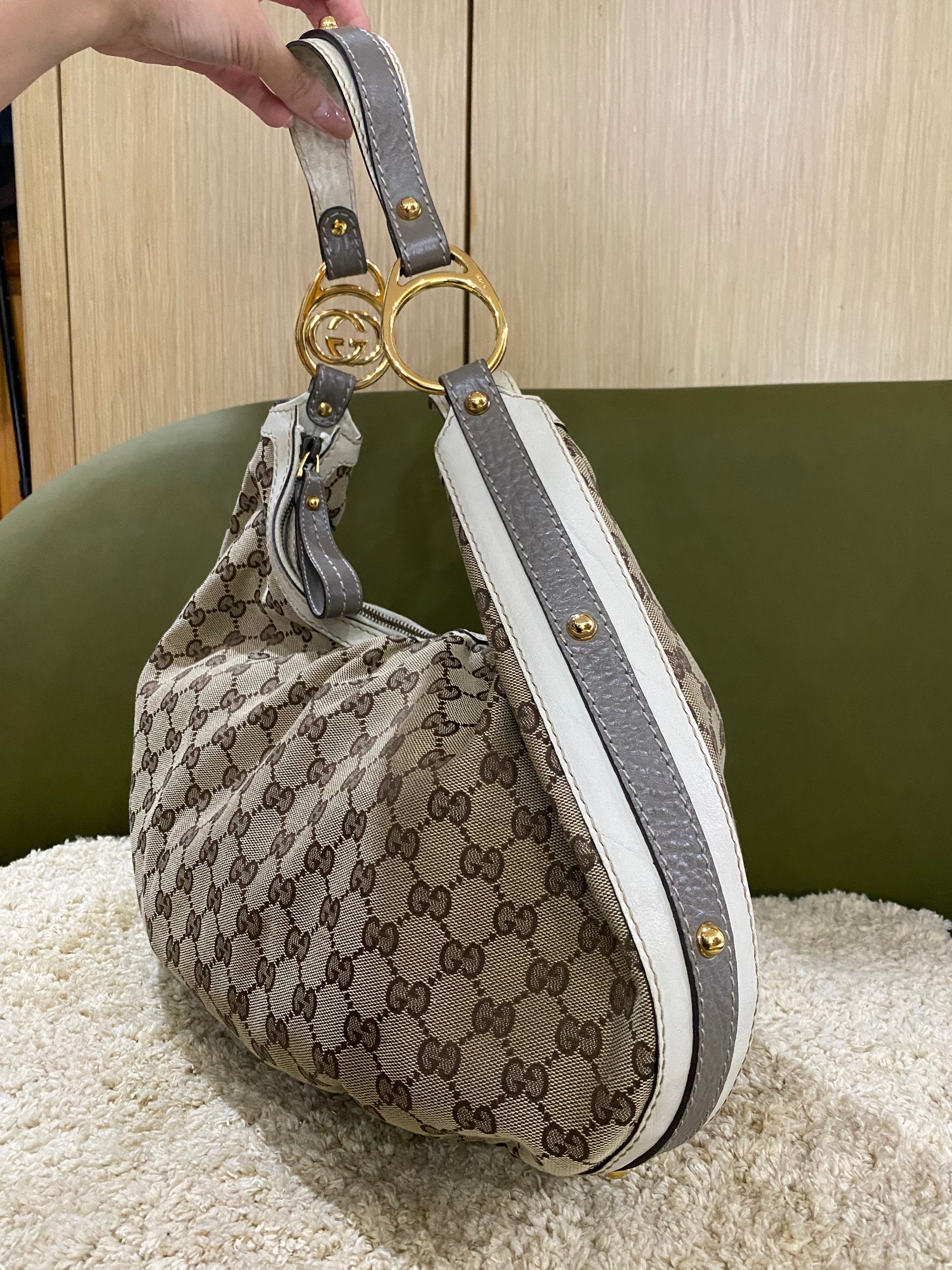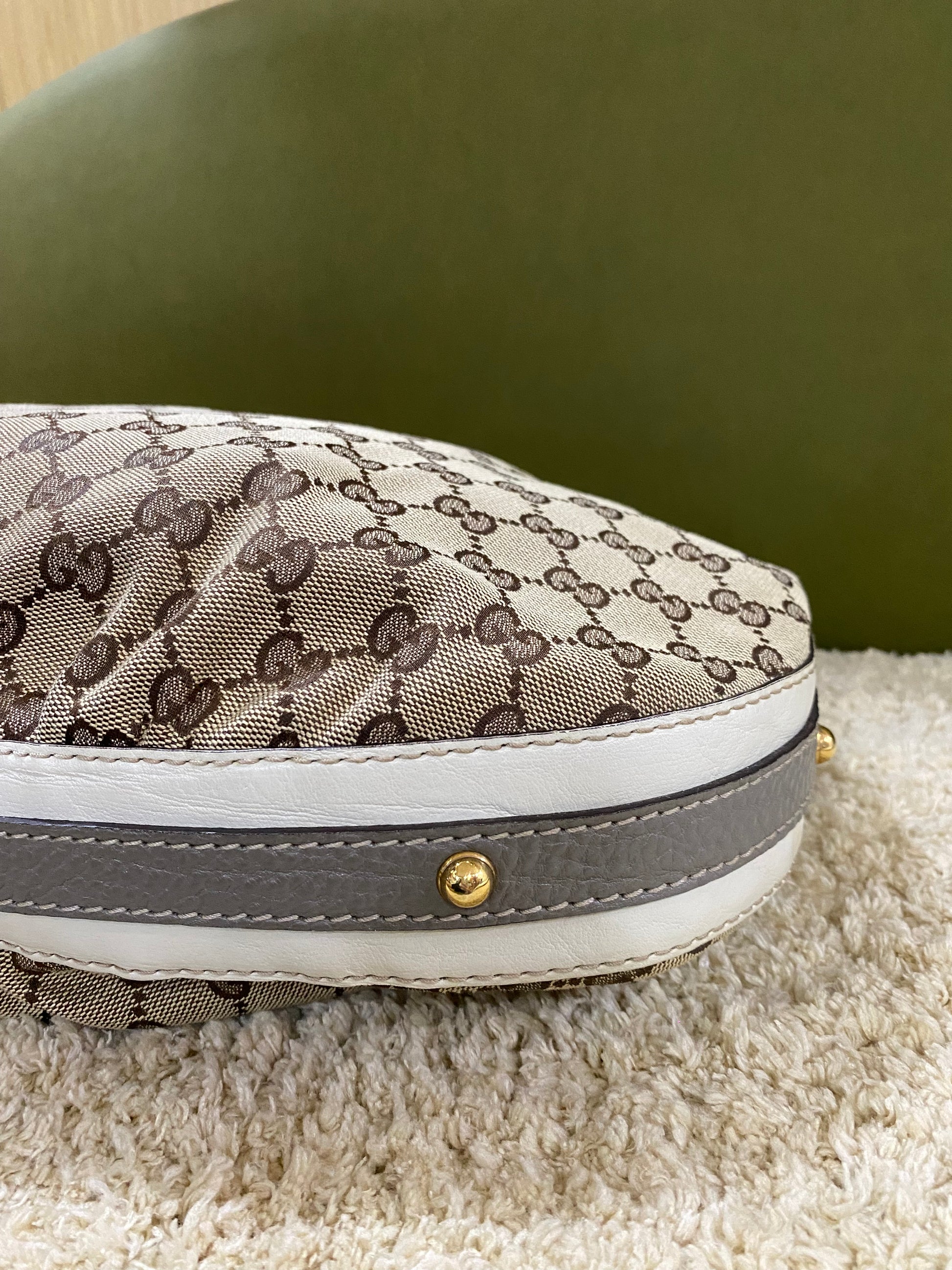 This Gucci Amalfi small size hobo shoulder bag features signature monogram canvas, white leather piping, and light gold tone hardware detailing. Shoulder fitted loop style handle for easy carrying, and Gucci engraved details for style.