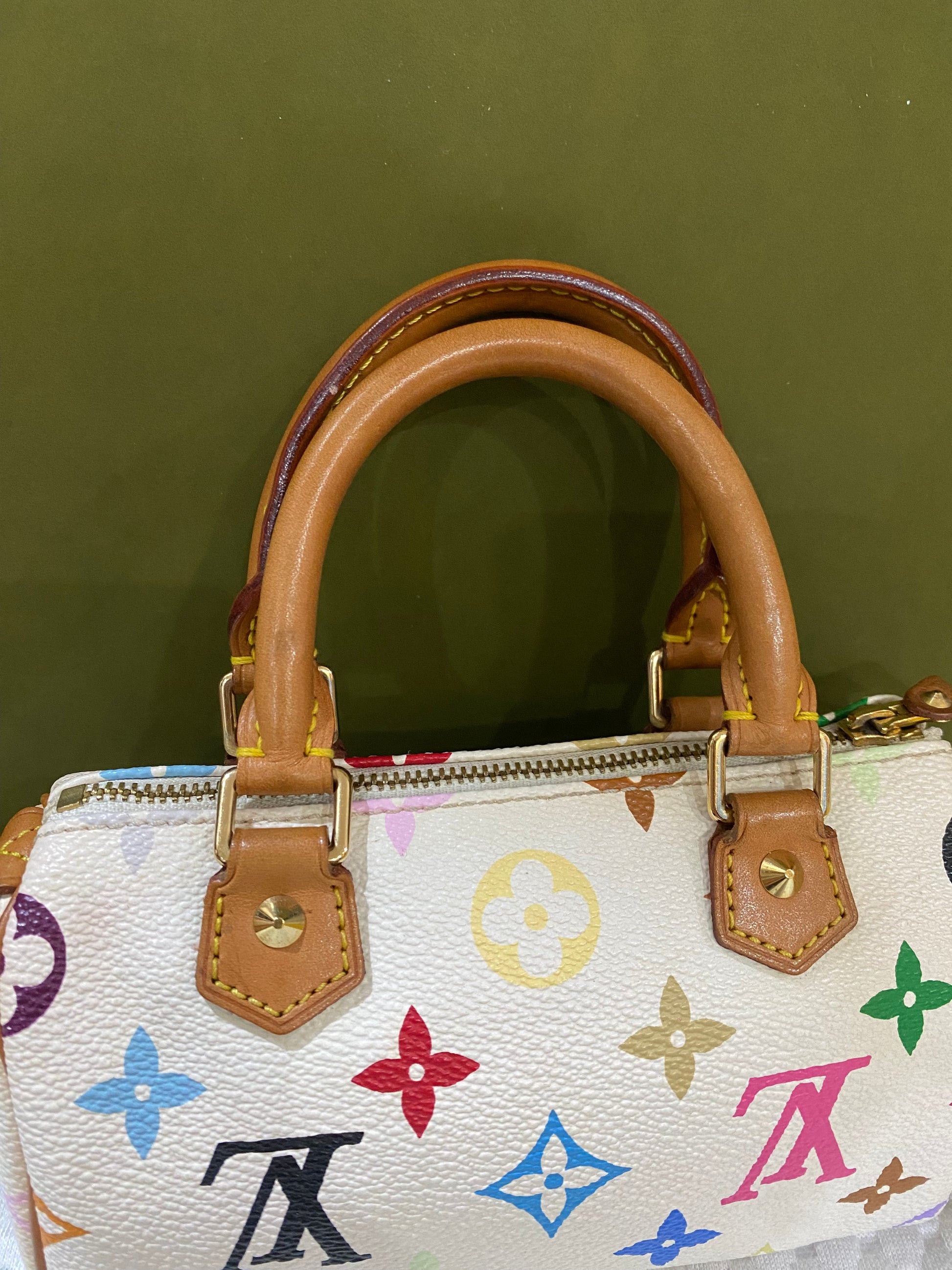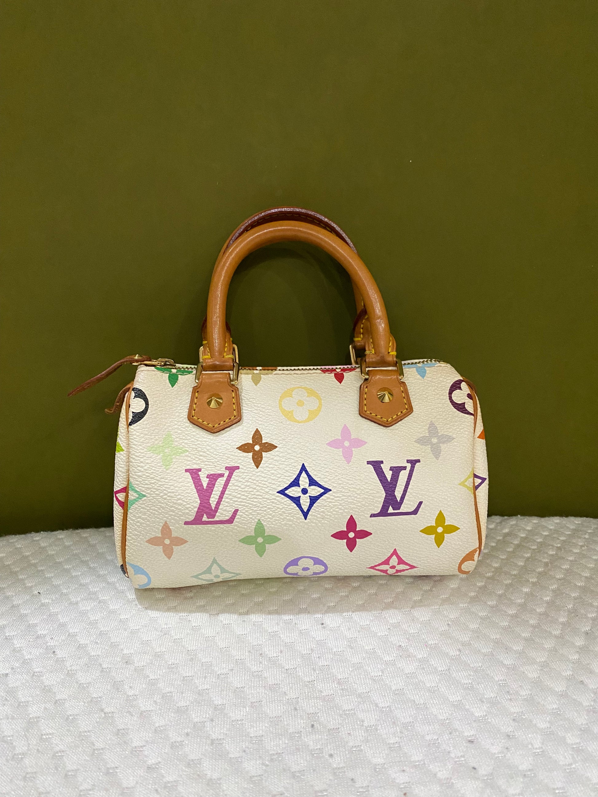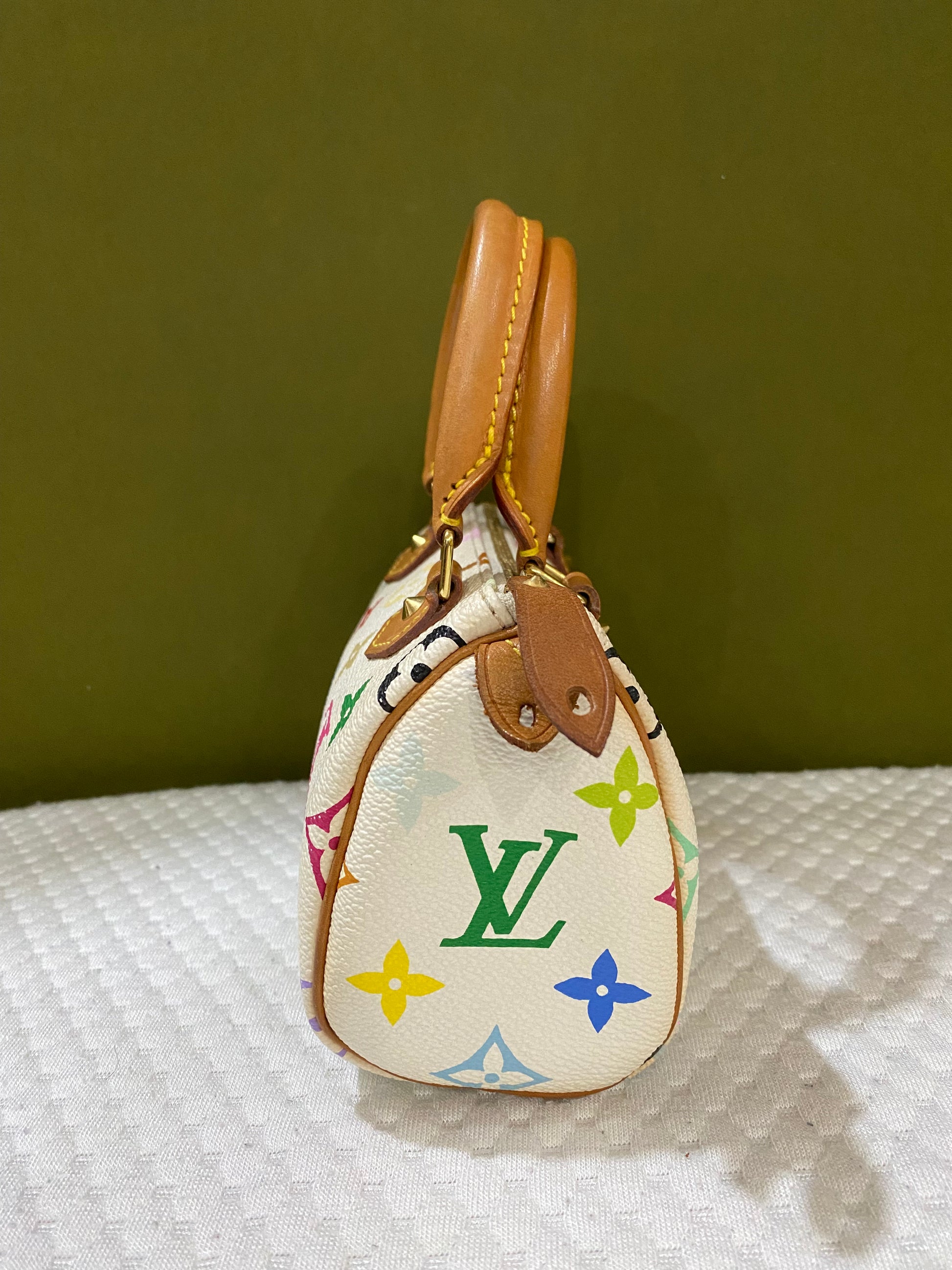 Louis VUITTON X Takashi MURAKAMI NANO SPEEDY bag, 2003 Limited edition White multicolor "Murakami" Monogram canvas and natural leather Gold-plated brass.
