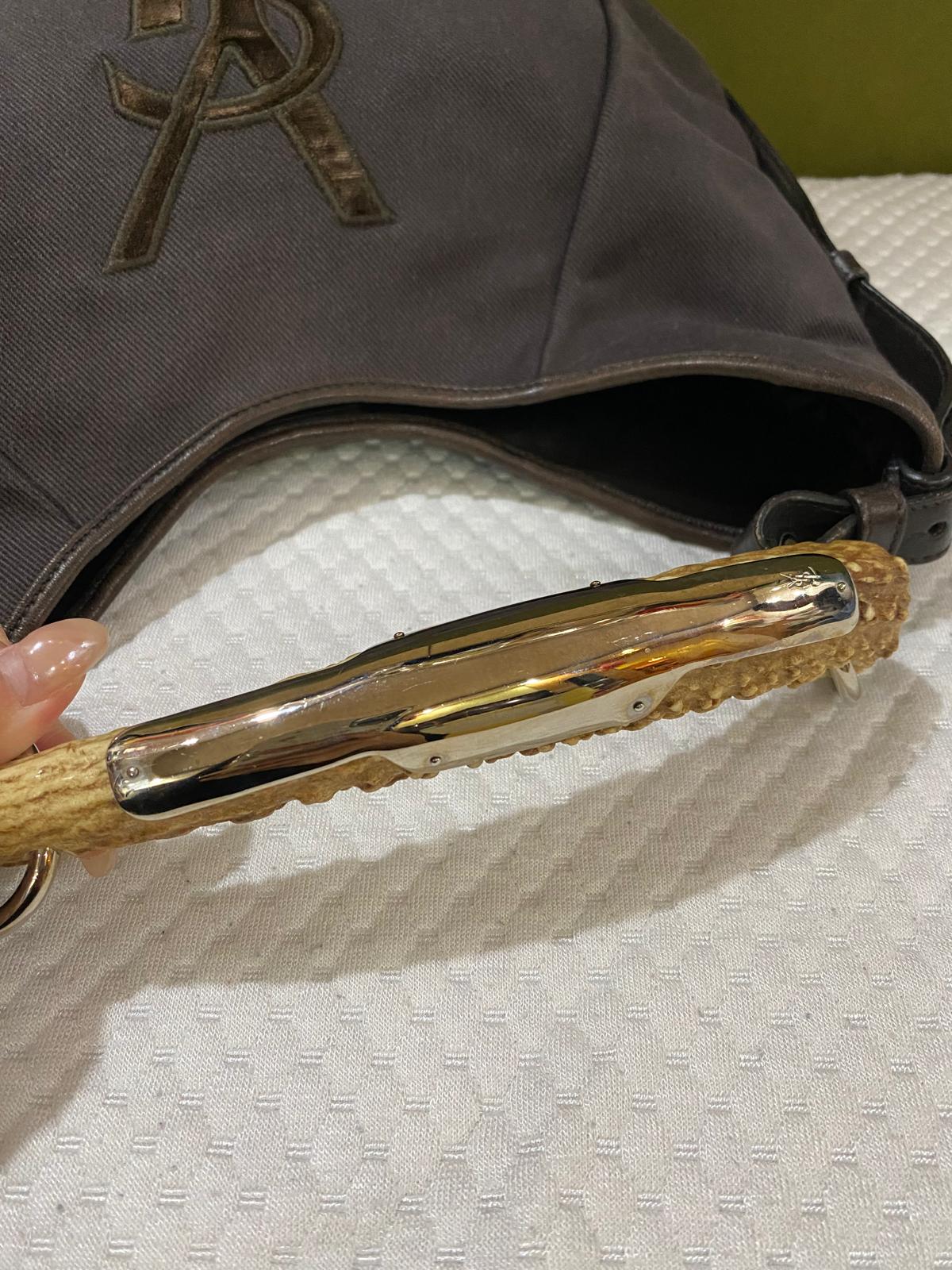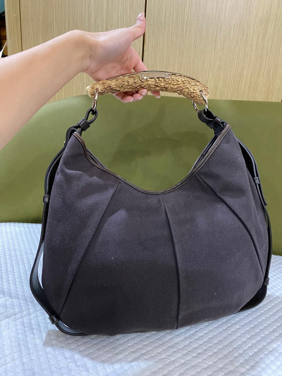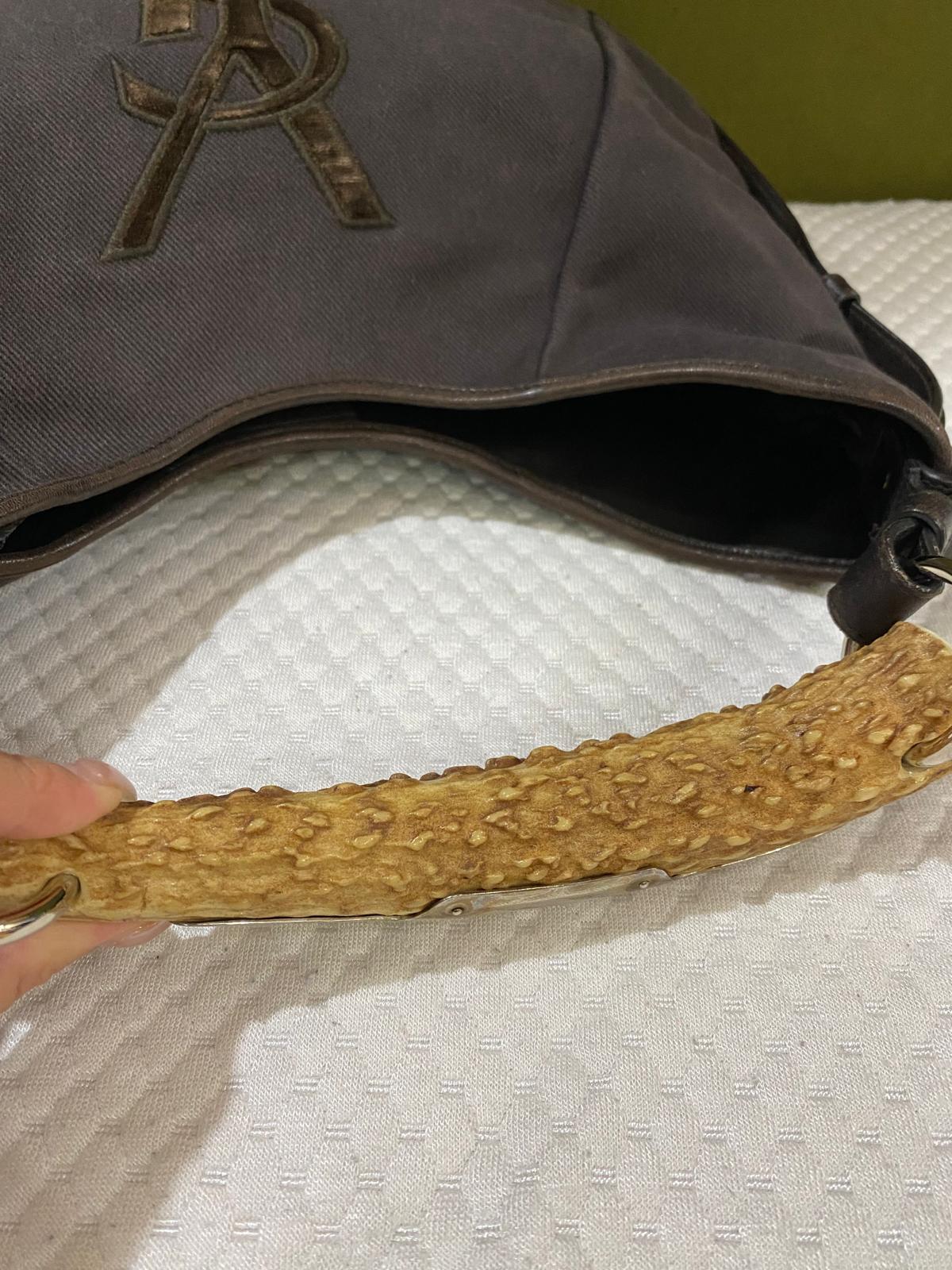 This stylish shoulder bag is crafted of denim fabric. It features a looping side to side shoulder strap featuring an antelope horn section with silver detailing and silver hardware links and hoops. The top opens to a spacious satin lined interior with a zip and cell phone pocket. This chic shoulder bag from Yves Saint Laurent is perfect for dressing up or down. So easy to match with any outfit!
